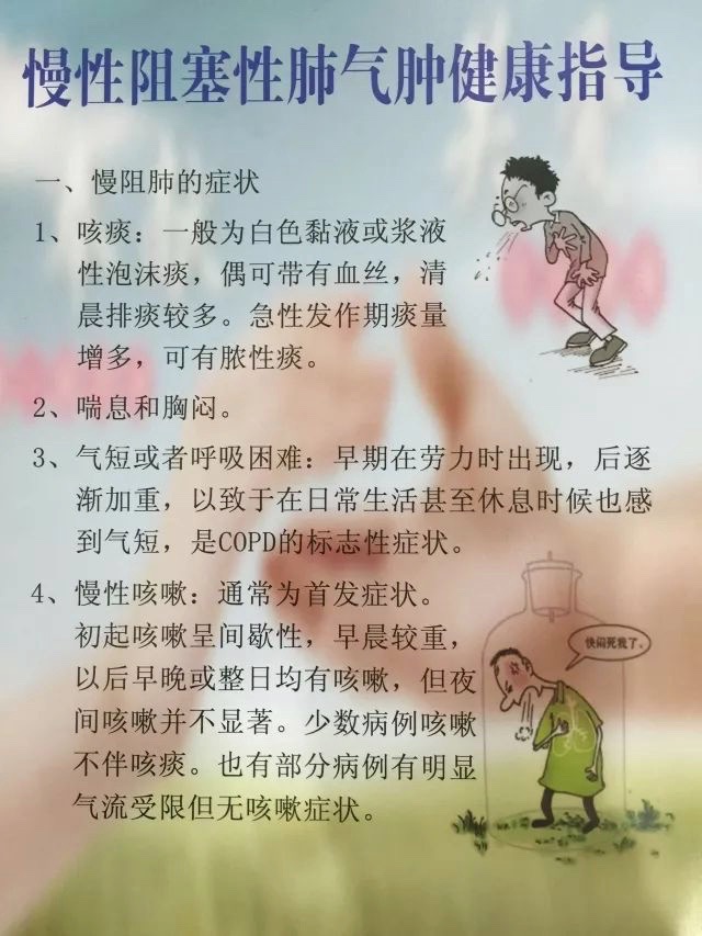 COPD是一種以不完全可逆的氣流受限為特征的慢性氣道炎癥性疾病, 通常以慢性咳嗽為首發(fā)癥狀,咳少量黏液性痰,標(biāo)志性癥狀為氣短或呼吸困難。多于中年以后發(fā)病,癥狀好發(fā)于秋冬寒冷季節(jié),常有反復(fù)呼吸道感染及急性加重史。隨病情進展,急性加重愈漸頻繁。當(dāng)慢性支氣管炎、肺氣腫患者肺功能檢查出現(xiàn)氣流受限,并且不能完全可逆時,即能診斷為COPD。一般認(rèn)為引起COPD的危險因素包括個體易感因素以及環(huán)境因素兩個方面,其中吸煙、職業(yè)性粉塵和化學(xué)物質(zhì)、感染和大氣污染是主要的環(huán)境因素因素。隨著COPD病程的不斷進展,不僅對呼吸系統(tǒng)會造成嚴(yán)重損害,其他重要臟器也會受到嚴(yán)重影響,導(dǎo)致呼吸衰竭、肺源性心臟病和右心衰竭、自發(fā)性氣胸等。