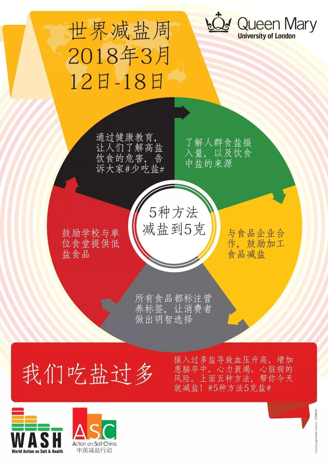 自2005年英國創(chuàng)立“世界鹽與健康行動(dòng)”(World Action On Salt and Health, WASH)以來,全球已有近100個(gè)國家加入。每年通過3月份開展的“世界減鹽周”(World Salt Awareness Week)活動(dòng),在世界各地廣泛開展鹽與健康的宣傳倡導(dǎo)活動(dòng),以提高公眾對高鹽飲食危害健康的認(rèn)識(shí),鼓勵(lì)每個(gè)人在日常生活中做出更加健康的選擇;同時(shí)號(hào)召政府、食品企業(yè)采取積極行動(dòng),設(shè)定減鹽目標(biāo)、制定減鹽政策,共同營造有利于人群健康的社會(huì)環(huán)境。