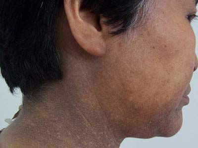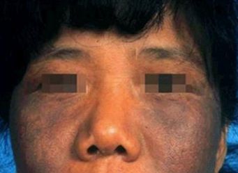 職業(yè)性黑變病的主要表現(xiàn)就是有明顯的黑色或黑褐色的色素沉著形成的斑塊。該斑塊呈彌散性分布,主要見于面部、頸部,也可見于腰部、四肢等未暴露在陽光下的部位。