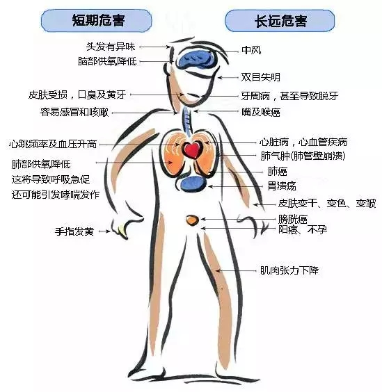 二手煙暴露可以導致肺癌、煙味反感、鼻部刺激癥狀和冠心病。此外,有證據(jù)提示二手煙暴露還可以導致乳腺癌、鼻竇癌、成人呼吸道癥狀、肺功能下降、支氣管哮喘、慢性阻塞性肺疾病、腦卒中和動脈粥樣硬化。