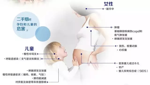 孕婦暴露于二手煙可以導致嬰兒猝死綜合征和胎兒出生體重降低。此外,孕婦暴露于二手煙還可以導致早產(chǎn)、新生兒神經(jīng)管畸形和唇腭裂。